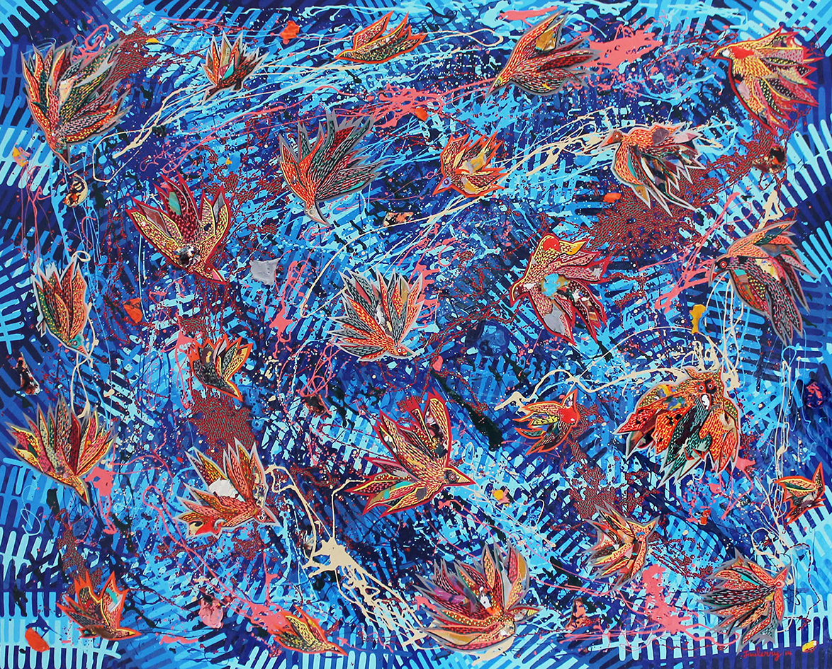 Birds (Dark Blue), 2014, enamel, acrylic and collage on canvas, 162 x 130 cm.