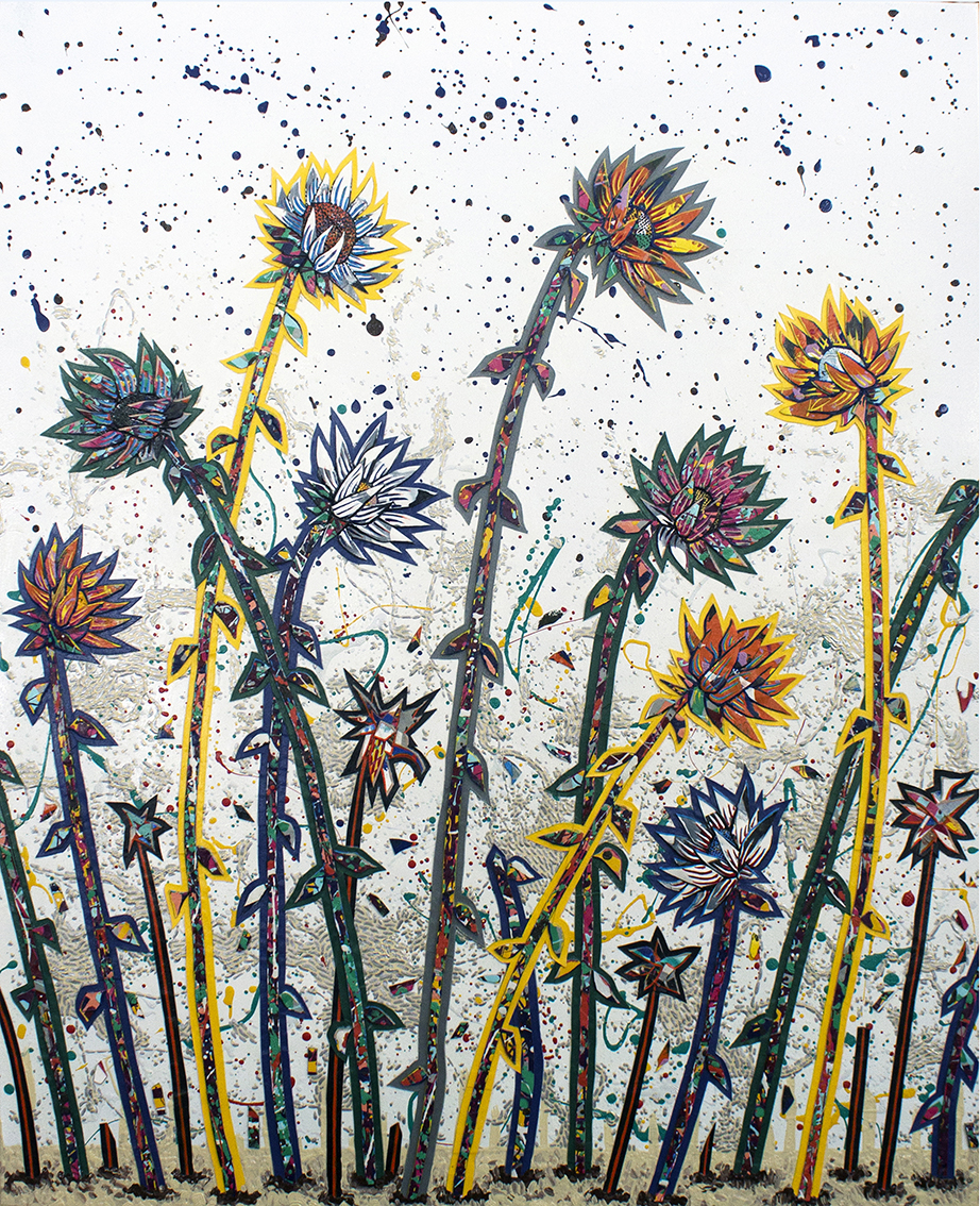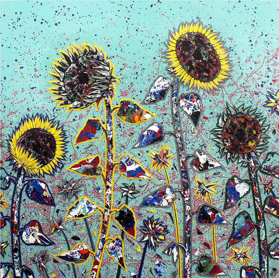 En utilisant une technique de collage absolument personnelle et un univers qui oscille entre abstraction et figuration, ces œuvres ont une double dimension. De loin, les tableaux ressemblent à des mosaïques de couleurs vibrantes. À proximité, vous pouvez découvrir que les fleurs et les oiseaux représentés sont conçus en superposant des fragments de toiles découpés dans des œuvres peintes antérieurement. Cette accumulation de collages leur donne un caractère de bas-relief. Chaque oiseaux ou fleurs sont assemblés individuellement, avant d'être collés sur la toile comme un puzzle. La campagne où je vivais et la nature ont été des sources d’inspiration pour ses peintures.